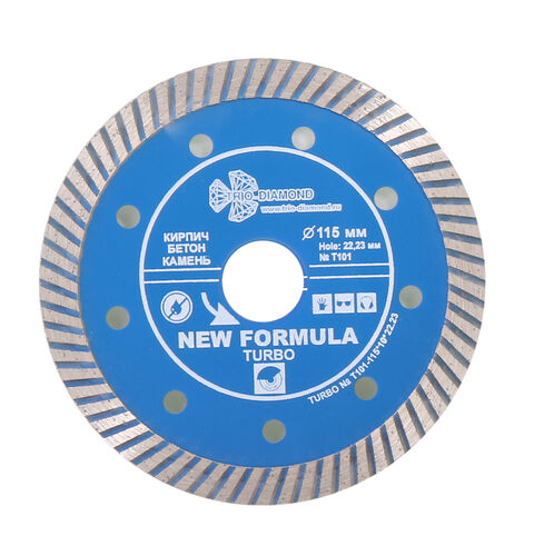 Диск алмазный сегментированный "ТУРБО" предназначен для резки бетона, гранита, кирпича, камня, мрамора и других строительных материалов. Он применяется совместно с угловой шлифовальной машиной для сухой и влажной резки. Время непрерывной работы не должно превышать 60-90 сек., потом в течение 20 сек. следует охлаждать диск на холостом ходу. На поверхности круга изображена стрелка для того, чтобы правильно выбрать направление вращения. Использовать диск для резки металлов запрещено. Для восстановления его режущей способности необходимо выполнить серию резов по однородному абразивному материалу.