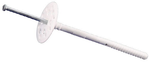 Дюбель для теплоизоляции из пластмассы имеет гвоздь, который производят из нейлона с добавлением стекловолокна. Он лёгкий, ударопрочный и может принимать нагрузку до 350 кг.