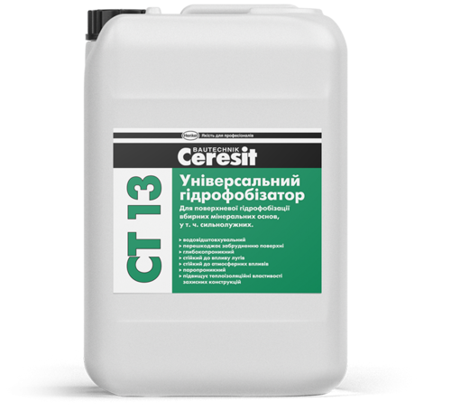 Универсальный гидрофобизатор Ceresit СТ 13 предназначен для придания гидрофобных свойств сильнолужним основам (бетон, цемент, силикатный кирпич, штукатурка и другие минеральные основания). Обеспечивает водозащитные свойства минеральных оснований, покрытых микротрещинами (до 0,2 мм).