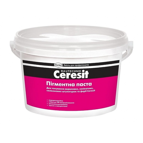 Пигментная  паста предназначена для тонирования декоративных штукатурок и красок Ceresit. Тонирование пигментными пастами  выполняется согласно инстукциям которые предоставляются изготовителем пигментных паст. Поставляется 16 цветов пигментных паст.